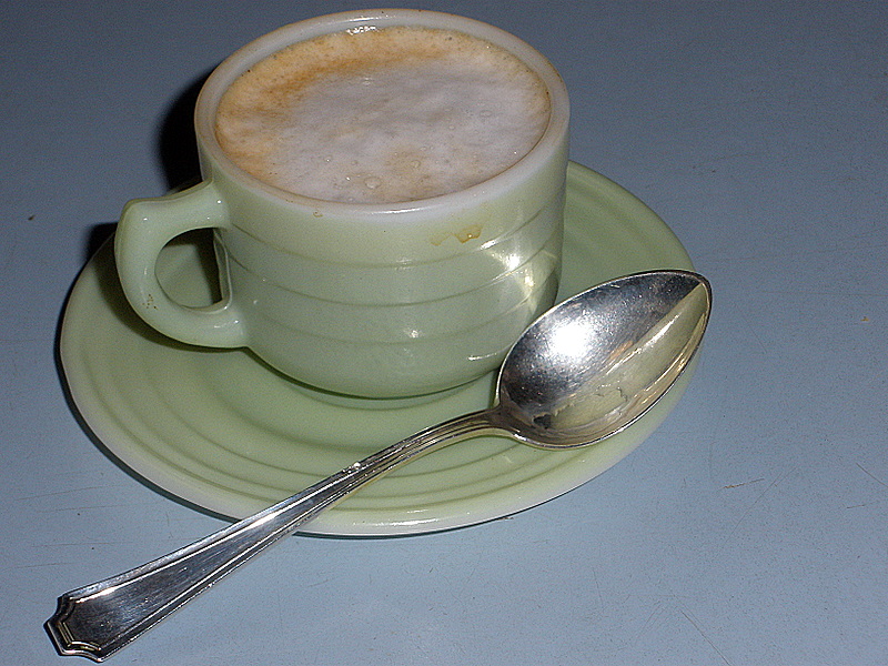 One perfect cappucino in an antique demitasse from Elm Hall plantation in Assumption parish near Napoleonville, stirred with a silver spoon (Fairfax by Durgin, circa 1910).  Beats the coffee shop’s paper cups by a mile, especially since I don’t even have to leave the house for this one.