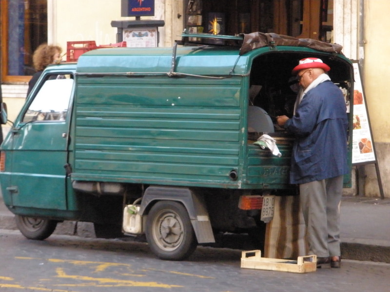 His slightly modernized counterpart was seen just off the piazza Navona in his tiny truck/workshop, painted the same color as cavolo nero (tuscan kale).