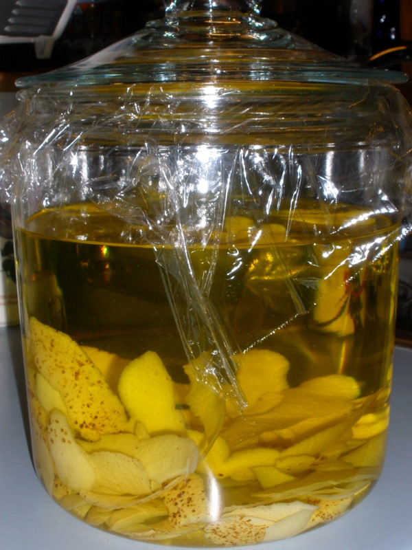 After five days, the Everclear is distinctly yellow-tinged, and the aroma is citrusy, though the taste is still pure hooch. The brown blemishes on the peels are slight imperfections caused by bird pecks: some limoncello recipes stress the need for blemish-free peels, claiming that any imperfections cause bitterness. But, I don’t have any “perfect” lemons. I figure that an italian peasant wouldn’t have skipped making limoncello this year just because birds pecked all of his lemons. If the finished product turns out bitter, I’ll know why, and I’ll savor the flavor as a mark of terroir!
