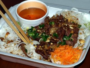 It’s almost always Vietnamese food–I’m always craving a bahn mi, or a steaming bowl of pho tai. This week’s fix was takeout bun thit nuong from Pho Tau Bay (113 Westbank Expressway, Gretna, LA).