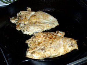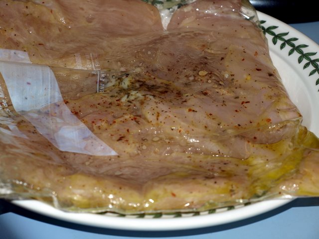 Pounding boneless, skinless chicken breasts or thighs to a uniform thickness is the key to a crisp yet juicy high-heat saute. I put a single chicken piece at a time inside a heavy duty zip top bag, then pound the chicken as thin as I can manage without tearing the flesh. (( use a heavy aluminum meat mallet with a smooth head.) When all of the chicken is flattened, it all goes back inside the bag, along with a tablespoon or two of olive oil, freshly squeezed Meyer lemon juice, herbes de provence, red pepper flakes, salt, and two garlic cloves (run through a press).