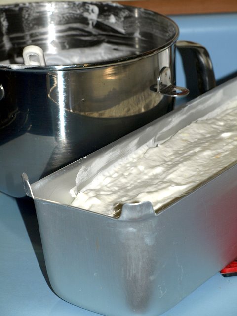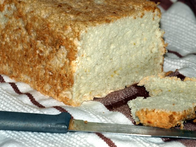 I’m working my way to the bottom of a large bag of Meyer lemons, picked before the recent cold spell set in. A glut of citrus fruit can be a kitchen challenge: how to use LOTS of lemons before they spoil? Poking around in the kitchen, I remembered my pre-Christmas purchase of an angel-food loaf pan.