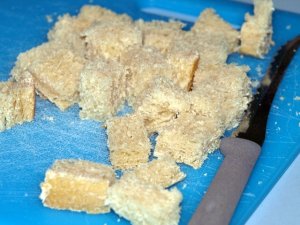 Packaged croutons are, I think, an excellent indicator of modern American decadence. Are we, collectively as a country, really too lazy to cube a slice of bread and toast it? It’s certainly an indicator of how deeply entrenched processed foods are in the U.S. diet. I say it’s time to take a stand: shake off the yoke of Campbell’s Soup (parent company of Pepperidge Farm), Castle Harland (the private equity firm that owns Marie Callender’s), and Con-Agra (maker of Salad Bar Selects)! Make your own croutons–take back your kitchen!