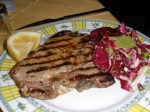 Row 3: entrees. Plate 1–buffalo milk mozzarella with mixed greens; Plate 2–grilled pork chop (from a pig raised on the property), garnished with lemon zest; Plate 3–fennel & sage pork sausage (also made in house from the villa’s own pigs).