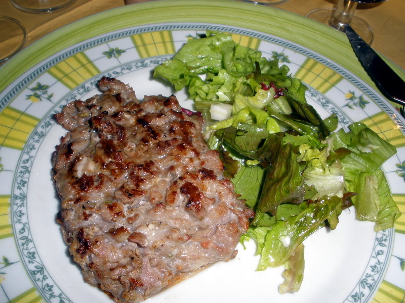 Row 3: entrees. Plate 1–buffalo milk mozzarella with mixed greens; Plate 2–grilled pork chop (from a pig raised on the property), garnished with lemon zest; Plate 3–fennel & sage pork sausage (also made in house from the villa’s own pigs).