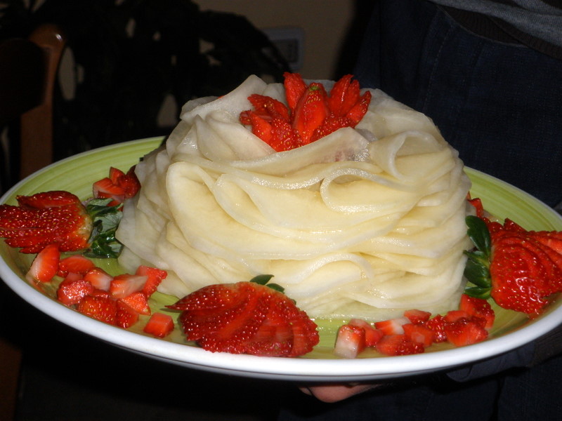 Row 6: Plate 1–a “cake” of honeydew melon slices, grown in summer and kept hanging in the storeroom until winter, garnished with strawberries; Glass 2–homemade limoncello, the ending to every meal.