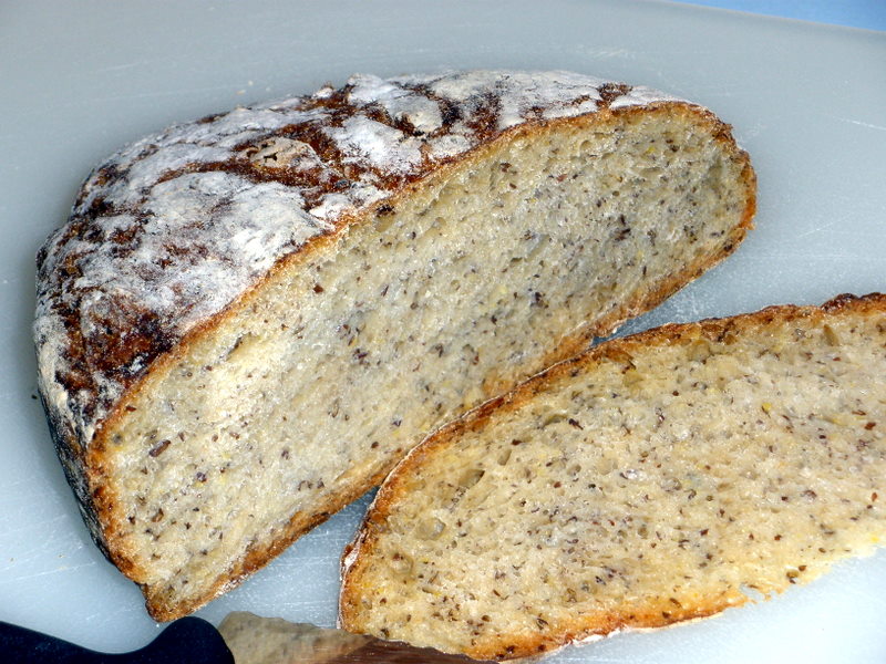I’m still playing around with the recipes in Jim Lahey’s My Bread cookbook. As I’ve mentioned before (here, and here, and here, and once more here), the appeal lies in the simplicity of the no-knead technique and the wonderful, rustic texture, featuring a thick, crunchy crust and open, irregular crumb. Too often, though, I’ve been disappointed in the flavor of the resulting loaf breads. Not anymore: I finally made a Lahey no-knead I really, really like! I started with his Pane Integrale recipe, a part-whole-wheat loaf (p. 61), and tossed in some ground flaxseed. Wow–a burst of flavor and more interesting texture. Try it yourself….ground flaxseed is sold alongside the nutritional supplements & vitamins in most big-box chain stores. Once opened, store ground flaxseed in the freezer for best flavor.