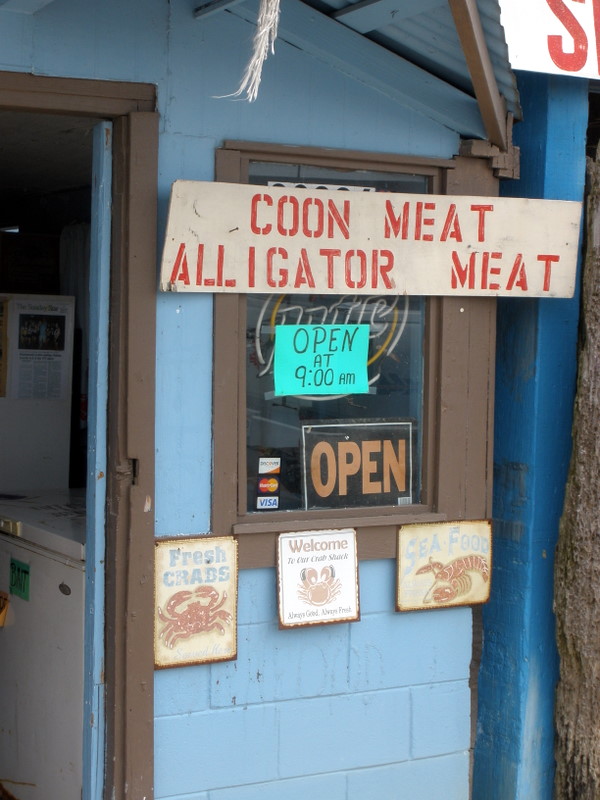 Need some raccoon meat? Head over to Reno’s Seafood (30226 Hwy 51, Akers, LA), just up the road from Middendorf’s, which sells everything from alligator, crabs, and shrimp, with a little raccoon thrown in. Perched on the edge of the highway in the middle of the Manchac swamp, Reno’s sells a little of everything (ice, bait, soft drinks) from a weatherbeaten cinderblock building. I can understand alligator being categorized as seafood, but raccoon seems to stretch the boundaries a bit, no?