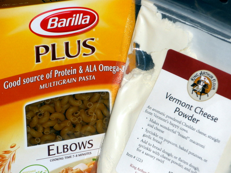 While I haven’t had a box of Luxury in many years, I did spot Vermont cheddar cheese powder in a recent King Arthur Flour catalog….the blurb suggested “Make your own boxed mac-n-cheese,” and I immediately placed an order. Could I re-create the Luxury taste without the box? Barilla Plus higher-protein pasta (made with wheat and legume flours) would have to substitute for standard noodles, and I managed to sneak in some green vegetables, but the results were pretty close. Since the cheese powder doesn’t contain coloring, it lacked the characteristic bright orange flair. Still, it was a taste trip down memory lane.