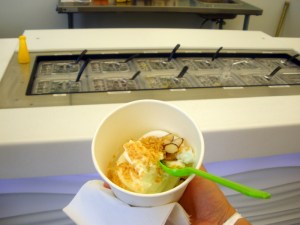 Uptown New Orleans’ latest entrant into the tart yogurt market, Pure Yogurt Culture, is located at 8108 Hampson Street in Riverbend, just around the corner from Camellia Grill and mere steps from the Carrollton streetcar line.  Pure allows customers to swirl their own fro-yo and sprinkle on as many toppings as desired;  pictured is plain yogurt topped with toasted coconut and sliced almonds.  The self-service model inevitably leads to larger servings, which are priced by weight.