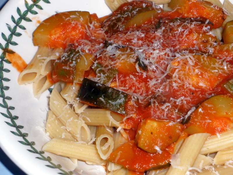 Before I start donating surplus homegrown zucchini to the Gulf of Mexico/BP Deepwater Horizon oil-spill cleanup efforts as biodegradable oil containment booms, I decided to attempt a few more squash-centric recipes.  This no-brainer proved a hit…unpeeled chunks of zucchini simmered in a garlicky marinara until tender.  Rather than becoming watery or flaccid, the chunks absorbed the tomato sauce and retained a slightly firm bite (perhaps because of the acidity?)  Ladled over pasta, the zucchini sauce was a nice, lower-calorie alternative to my usual, meat centric red sauce.  A sprinkling of finely grated Parmesan added some zip (but don’t most savory foods improve with a tiny sprinkling of finely grated Parmesan?)