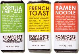 Ramen noodles and chocolate? Tortilla, salt, and lime chocolate? Komforte chocolates pairs sweet & savory in these specialty bars.