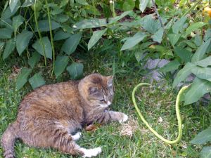 Back in ’08, I bought a packet of yard-long bean seeds in San Francisco’s Chinatown, at a shop somewhere on Grant Avenue near Red Blossom Tea. I finally got around to planting the beans this year, and despite the long delay, they sprouted right up. I have a quickly maturing crop of the yardlong, squiggly beans, which also serve to entertain my two-foot long (somewhat feral) female cat. She likes to hang out in the cool shade cast by the tall bean plants.