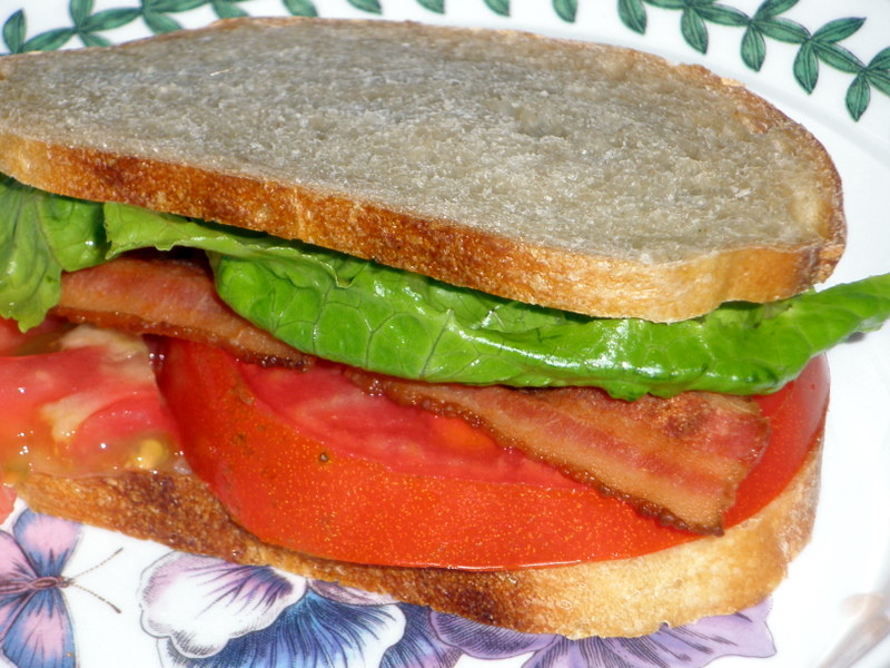 Nah, it’s not the year-end holiday season. It’s tomato season, friend. Fresh, vine-ripe, still-warm-from-the-garden beefsteak tomatoes, layered onto homemade wild-yeast sourdough bread with a bit of lettuce, a smear of mayo, and lots of crisp bacon.