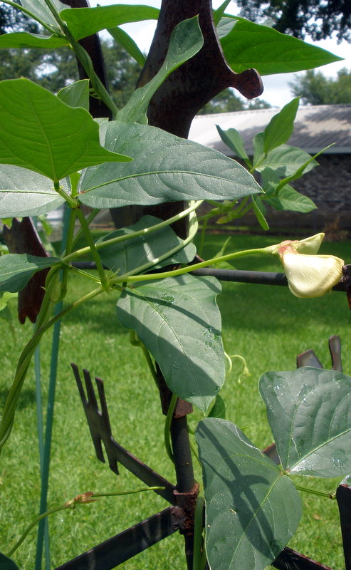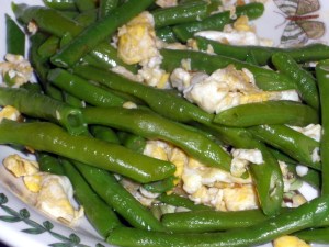 Long beans grow faster than St. Augustine grass; these beans love the heat and rain, and I seem to be picking them almost daily. One vine is more than 6′ tall, and still it climbs skyward, throwing up big yellow flowers. The long beans far exceeded my expectations, and I’ll definitely make room in next year’s garden for a repeat crop. In my quest to use up the long beans (called chopstick beans in Vietnamese) bursting forth from my garden, I found this garlicky bean and egg dish in Mai Pham’s excellent cookbook, Pleasures of the Vietnamese Table (p 202).