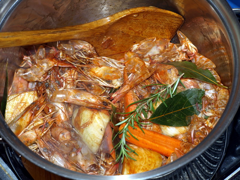 So if you’re one of those planning-ahead types who’s peeling ice chests of shrimp, stop for a minute and save the heads and shells. Get more bang for your buck and make a big pot of shrimp stock….it freezes nicely, will keep for months, and will add a nice shrimpy zing to fall’s gumbos, soups, and stews. If you feel the need to ration out your precious shrimp and begin to cut back on the ordinarily profligate amounts you toss into your dishes, the frozen shrimp stock will help to camouflage your shortage.
