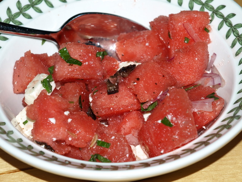 Still too hot to cook, or eat anything too heavy or complicated; fruits and veggies with lots of water are very appealing right now.  A few years ago, Nigella Lawson popularized watermelon-feta salad to the point of ubiquity; you could hardly go to a barbecue or potluck without the dish making an appearance.  Now that the novelty has worn off, it’s worth revisiting the savory-sweet-pungent salad as a satisfying hot-weather option.