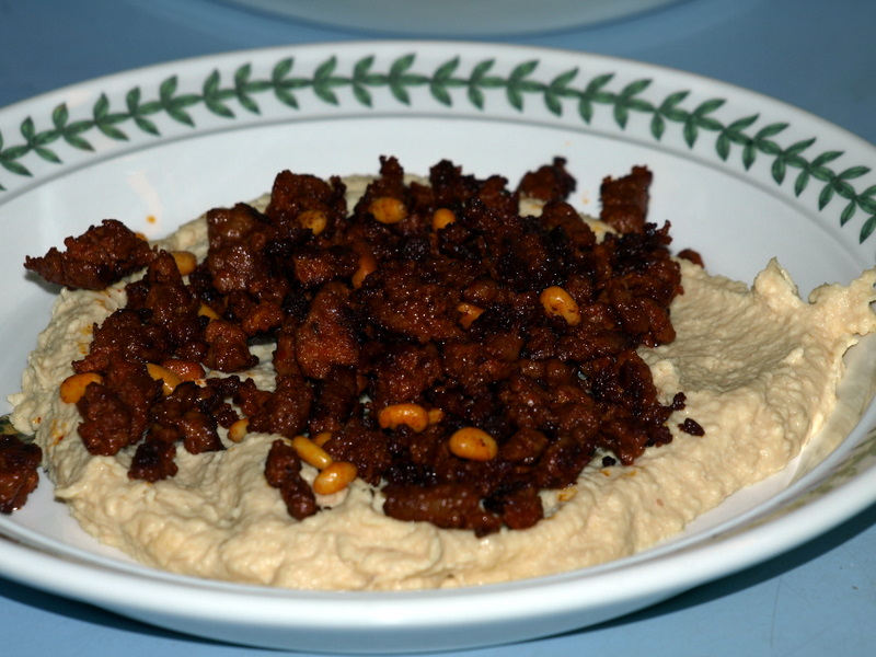 So what to eat with the watermelon-feta salad?  How about a meaty hummus?  Start with a base of (homemade or storebought) hummus, spread on a plate.  Buy a few merguez sausages (available locally at Whole Foods and Cochon Butcher), remove them from their casings, and cook in a skillet, breaking up the sasusage as it browns.  Toss in a handful of pine nuts to toast lightly.  When the sausage is cooked through, spread the merguez over the hummus.  Serve warm, with lots of pita.