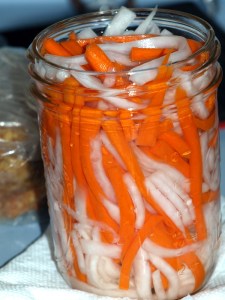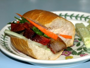Once armed with a nice, light loaf, homemade bahn mi are easy–just split the rolls and stuff with your favorite toppings and garnishes. I’m partial to ga nuong (marinated, grilled chicken; see recipe here), but when I’m feeling really lazy, I’ll make sandwiches with the succulent, boneless red-cooked pork sold on weekends at Hong Kong Market. A big batch of pickled carrot and daikon, a tangy and (to me) necessary component of an ideal bahn mi, will keep for a month (click here for Andrea Nguyen’s easy recipe).