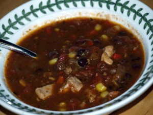 Brrr…bare, hardwood floors in a raised house are cold, y’all. The first extended cool weather of fall set in this week, and the weather gave me a fierce craving for chili. A quick freezer/pantry inventory revealed some boneless, skinless thighs, a tiny packet of ground turkey, black beans, dried ancho and pasilla chiles, and a few red and green bell peppers….45 minutes of kitchen improv yielded a tasty pot of black bean chicken/turkey chili, with whole-kernel corn as lagniappe. (Chili, like gumbo, is a great vehicle for improvisation….though I’m sure Texas purists believe otherwise.)