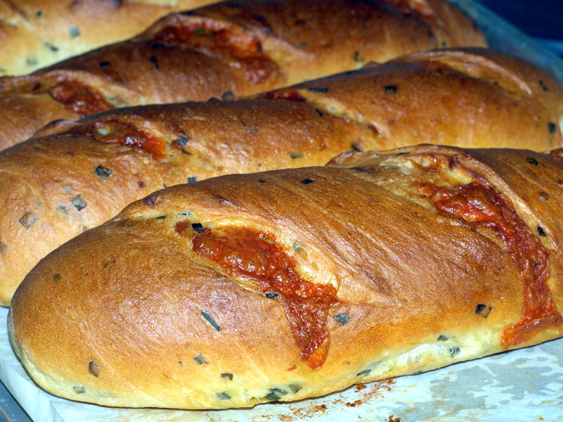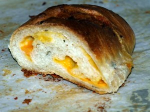 A failed loaf of challah (lousy attempt at baker’s math–never my strong suit) on Friday annoyed me so much I just had to bake something good. After refreshing my sourdough starter, I started working on pain au levain and potato-cheddar-chive torpedoes (pictured at left).