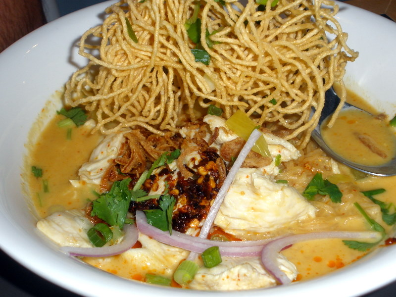 Always on the lookout for Thai food, I ventured over to Banana Blossom (2112 Belle Chasse Hwy, Suite 10, Gretna, LA; 504.392.7530) a while back.  The bare-bones, strip-mall space offers up better-than-average food, but the deliciousness was destroyed by a pack of noisy suburbanites and their raucous offspring.  (Yes, I’m a suburbanite myself, but a quiet, mannerly one.)  Despite not being able to hear myself think, I enjoyed the Chiang Mai curry noodles.
