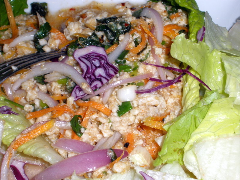 Cutting through the din was the  kitchen’s interesting version of larb (finely minced chicken, freshly prepared and hot, served with lots of lettuce for wrapping).  Often, this dish is cool or room temperature; the warm version demonstrated how dramatically temperature affects perception.   A bit of cabbage, strips of red onion, carrots, cilantro, basil, and mint offered something different in each bite.