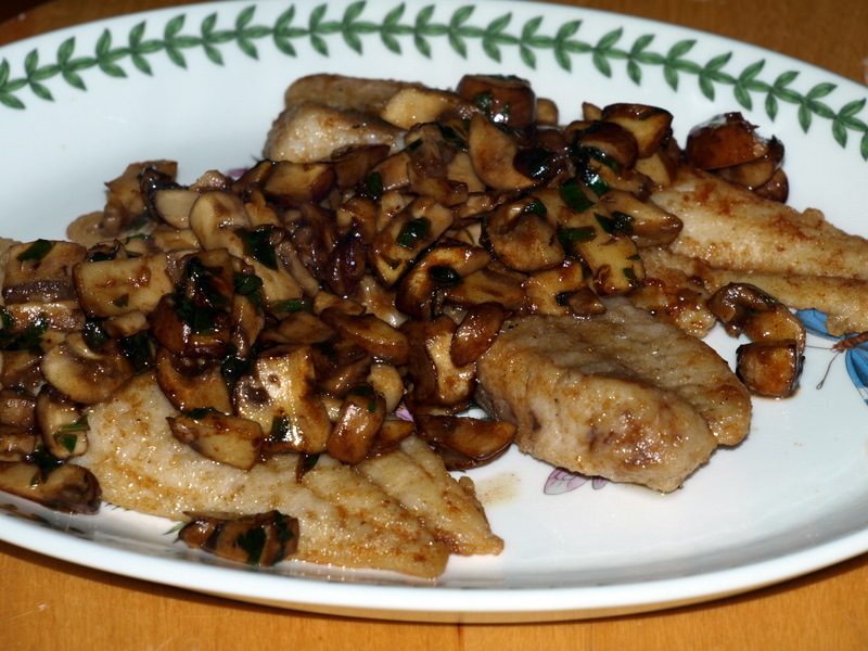 Combine flour, black pepper, cayenne, and salt in a shallow bowl. Dredge fillets in seasoned flour, shaking off excess. In a 10-inch skillet, heat butter over high until it foams, then reduce heat to medium-high. Arrange fillets in a single layer in the skillet; when undersides have browned nicely, turn gently. Continue cooking; when the second side is golden brown, remove fish to a warm serving platter. Increase the heat, and add chopped mushrooms to the pan; saute for 3-5 minutes. Once mushrooms have softened, add the lemon juice. Cook briefly, stirring and scraping the pan, to reduce the juice, then add the worcestershire sauce and parsley. Continue cooking until bubbly. If you don’t give a damn about cholesterol, swirl in the additional butter. When it stops foaming, pour the mushrooms and pan sauce over the fish.