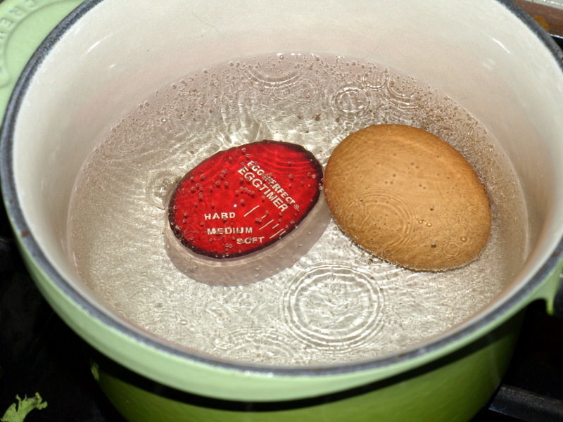 (Please don’t tell me that boiling a hunk of plastic is a bad idea. I figure that the eggshell is a sturdy, protective barrier against anything leaching out of the plastic timer.)