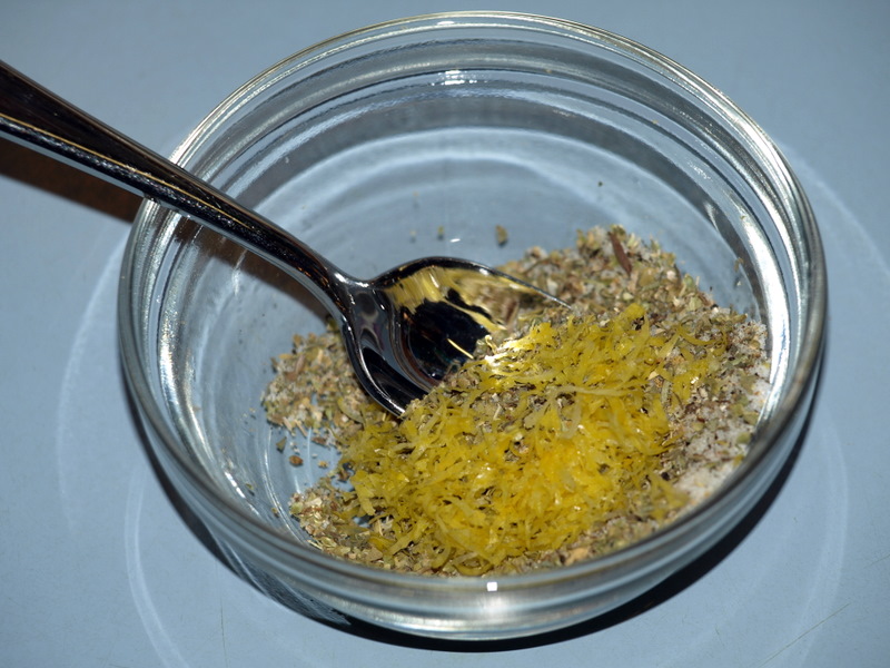 Prior to roasting, I rubbed the turkey with a blend of 1 teaspoon sea salt, 3 teaspoons herbes de provence, 2 teaspoons finely grated meyer lemon zest, and beaucoup freshly ground cracked pepper (I just cranked the grinder ’til my arm got tired), all mixed with enough olive oil to make a paste.  The seasoned breast roasted at 350 for roughly 90 minutes, then it rested 20-25 minutes before slicing.