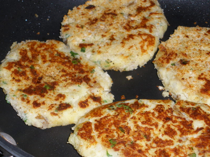 A bit of minced onion, a couple of egg yolks remaining from a baking project, fresh parsley, black pepper, and panko stirred into the mashed potatoes: it took longer to heat the pan than it did to make the potato cakes. Cook the cakes 5-8 minutes per side in butter until golden brown and hot throughout. The cakes make a nice accompaniment to roasted or stewed meats, greens, or on their own with applesauce and sauteed cabbage.