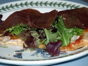 Once baked, slice into long rectangles and top with shaved Parmesan, baby greens and thinly sliced bresaola (or proscuitto, or coppa, or your favorite paper-thin Italian meats).