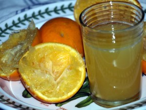 My citrus fruit abundance continues…a veritable tide of oranges rolls in every time I walk through the back yard. Fresh-squeezed juice IS very nice, especially when spiked with a slice of fresh ginger, a sprig of mint, or a few rosemary leaves muddled at the bottom of a glass.