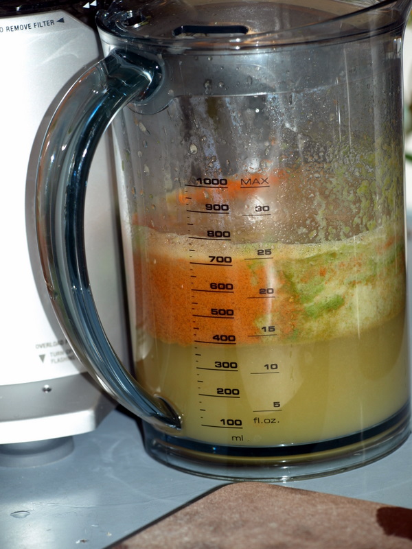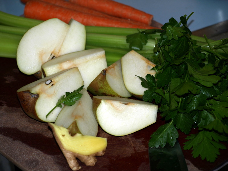 Like all noisy power tools, the juicer is fun to operate. I quickly began casting around for other juice-suitable stuff. Carrots, ginger, parsley: yum. Sweet potatoes: not so much, kinda starchy on the tongue. I even tried out the “Veggie Detox” recipe from p. 63 of the February issue of Bon Appetit, consisting of pears, ginger, carrots, celery, parsley, and lemon juice. I didn’t have the recipe-specified beets, so the color was bit pale and greenish-peach (see above, in the pitcher).