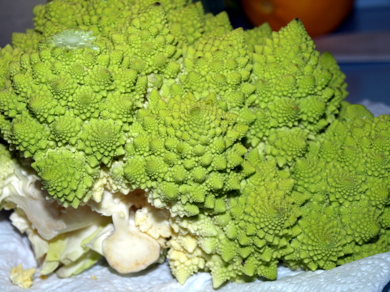 A recent trip to the German Coast Farmers’ Market yielded a locally grown, fresh broccolo romanesco, yet another typically Italian vegetable that has found its way to American gardens and tables. At first glance, it’s a striking plant, looking a bit like a geometric cauliflower, a broccoli with obsessive-compulsive disorder, or the favorite food of a dinosaur. The spring-green color stands in contrast to wintry cauliflower (or to the Carnival-festival gold and purple varieties), and the flavor is a milder take on its Brassica oleracea siblings (the sprawling clan includes all forms of cabbage, broccoli, cauliflower, broccoli rabe, brussels sprouts, and more).