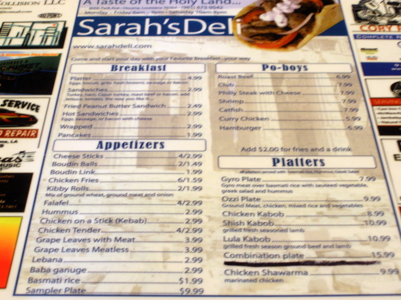 In south Louisiana, unlike most areas of the country, tasty food is often found in gas stations.  Usually, local filling station fare runs toward boudin, cracklins, plate lunches, and deep-fried delights like meat pies, crawfish egg rolls, and boudin balls.  But a  Houma establishment perched on the banks of Bayou Terrebonne has put a spin on the usual framework.  Sara’s Deli (8006 Park Avenue, Houma, LA), tucked inside Sara’s Discount gas outlet, does indeed offer boudin, poboys, breakfast, and plate lunches, but the eponymous cook & owner Sara Rimawi uses the deli’s menu to showcase the cooking of her native Jerusalem.
