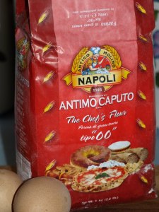 After trekking all over creation in search of the much-touted Caputo 00 flour, I finally gave up and mail-ordered 10 small, 1-kilogram bags.  (Yes, that’s 22 pounds of flour.  I have to clean out my freezer to store the flour.)  Caputo, milled in Naples, is famed as a pizza and pasta maker’s flour, formulated for maximum extensibility and milled to a talcum-powder fineness.  Lucky for me, the UPS man delivered the Caputo right alongside my new Kitchen Aid pasta roller attachments.