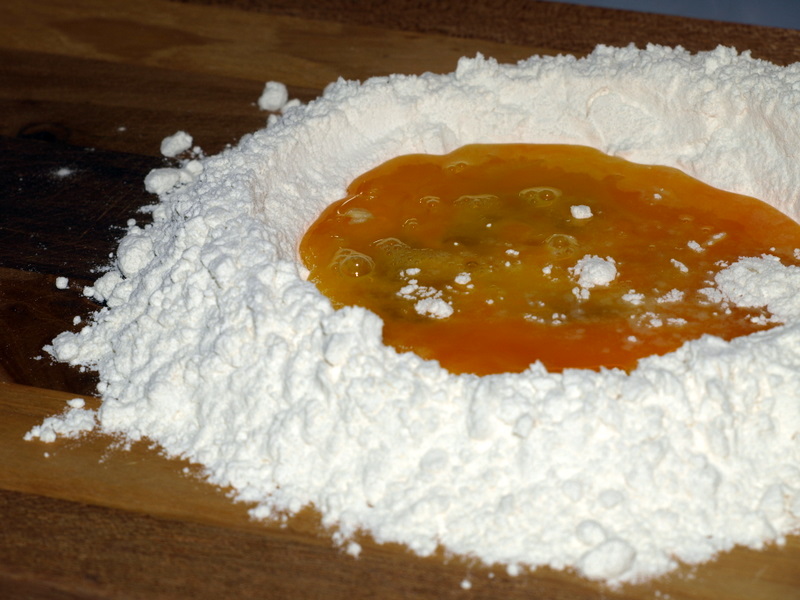 All of the books’ recipes started with a hillock of flour atop a cutting board or counter, then suggested I make a well in the middle and add egg.  Slowly, flour and egg stirred together begin to make a dough, which is kneaded until smooth.