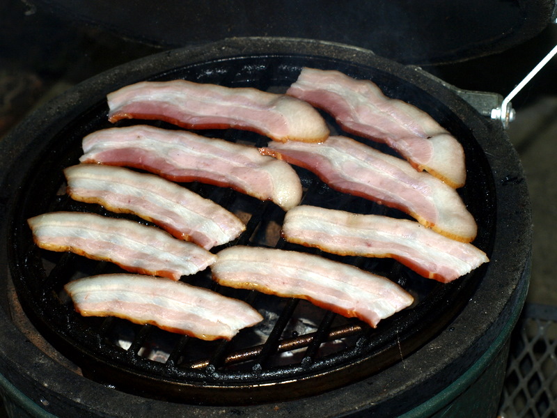 So I had Nueske’s on the brain when I rolled out of bed Sunday morning.  The sky was clear, despite earlier forecasts of thunderstorms, and I fired up my Mini Green Egg expressly to cook bacon.  [Now, if you’re thinking that a charcoal fire lighted expressly to cook bacon is overkill, I suggest that you’ve never sampled Nueske’s bacon when grilled.  ‘Cause if you had, you’d never suggest I was 75% crazy for firing up the Egg just to cook bacon.]