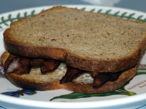 Anyway, good bacon deserves good bread, so I toasted a few thin slices of homemade whole wheat flax bread, added a thin film of bacon, and took a big bite.  Then I felt sorry for all the unenlightened who were pulling into fast-food drive-thrus for a Sunday morning pseudo-breakfast while I chewed.  Only one thing could have improved this sandwich:  a fat slice of tomato, but I’m still at least a month away from ripe, homegrown tomatoes.