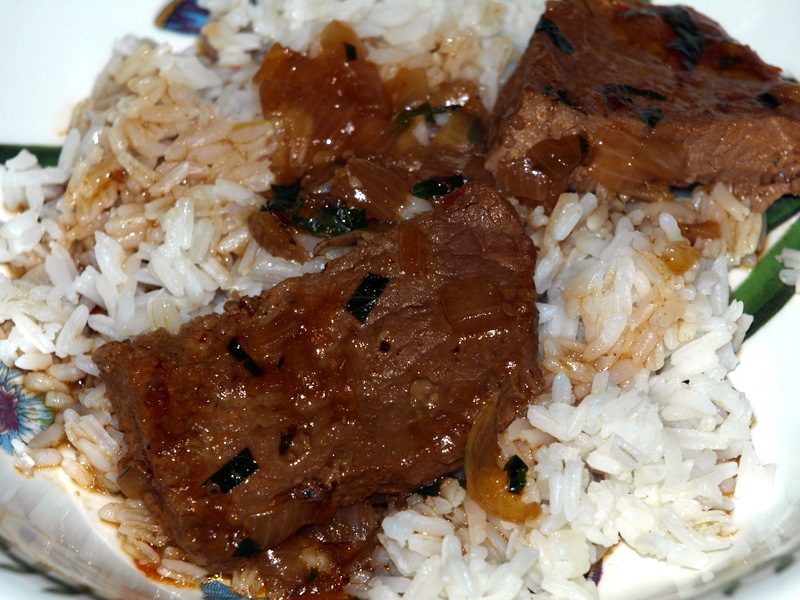 Is anything more dear to a Cajun’s heart than rice and gravy? I’m talking about not-too-thick, dark brown, garlicky gravy ladled over hot, slightly sticky rice. At my house, it’s most often beef gravy, but smothered pork chops or smothered chicken will generate righteous gravy when treated right; i.e., when gently braised in a covered pan on the stovetop. Just about any edible (vegetable or animal) will yield up a delicious liquid if subjected to a slightly wet stovetop braise–this is the legendary “smothering” technique central to south Louisiana cooking. It’s a way of tenderizing the tough that infuses the cooking liquid with the combined and reduced essences of everything in the pot.