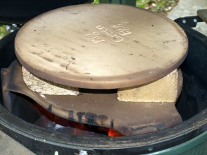 The “oven” set up: I cleaned all of the ash out of my BGE, poured in a full firebox of fresh lump charcoal, and lit the coals in two places.  The plate setter went in, legs down, and I added three firebricks atop it, then added the pizza stone.  Why firebricks?  The idea is to raise the pizza stone higher into the Egg’s dome, exposing the upper surface of the pizza to greater heat and ensuring that the bottom and top of the pizza brown at an equal rate.  After the Egg’s internal temperature reached 600 degrees, I waited 40 minutes, allowing the plate setter, fire bricks, and pizza stone to absorb the heat.  Meanwhile, I patted the defrosted dough onto parchment…