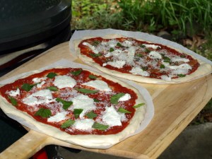 Now that I have my hands on a supply of Caputo 00 flour, I’m (once again) chasing after a truly good pizza crust.  No, I haven’t gone off the deep end and ordered a wood-burning oven (yet)….I’m just working out good pizza technique in my Big Green Egg.  What sort of crust am I chasing?  Hmm:  I’d like it to be thin, crisp-tender, charred in spots, and flavorful.  Ideally, it would fall somewhere between thin-but-soft Naples-style and the ultra-thin, crispier crust found in Rome.