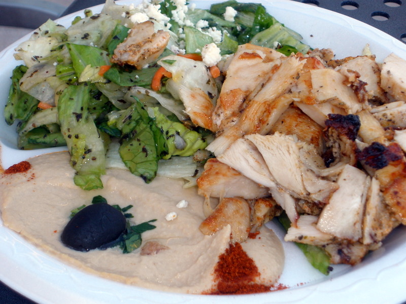 So I present for your consideration the #6 combination platter from Arzi’s Cafe (Mall of Louisiana food court, Baton Rouge; 225.769.9998), a pile of chicken shawarma, feta salad, and hummus.