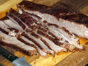 The almost completely lean brisket emerged succulent and tender, with no need for sauce, so I’m counting the hybrid smoke/braise as an unqualified success.  A bonus:  with a 5-hour cook time, it was easily the fastest brisket cook I ever attempted, and a testimony to the cooking knowledge found on a good Internet messageboard.