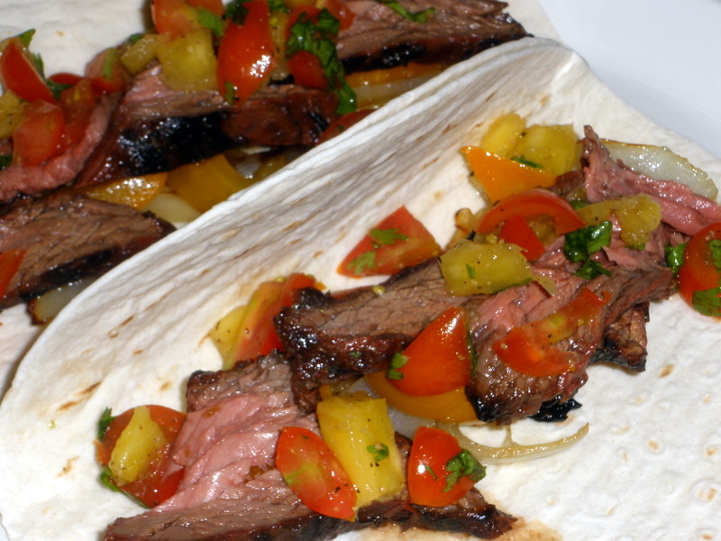 Go ahead and grill a few slices of yellow or red peppers and a handful of onions alongside the steak. To make soft tacos extra special, whip up a grilled pineapple salsa.