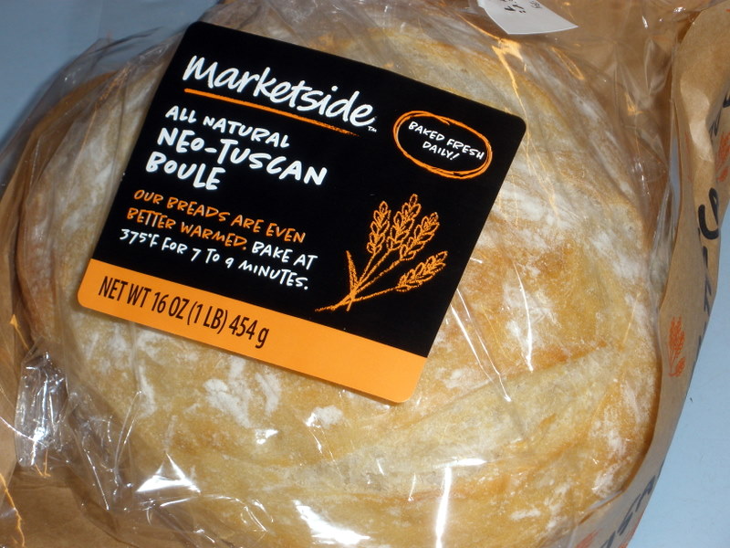 What am I looking for in a loaf of bread? As short an ingredient list as possible, which means no dough conditioners or baking powder, little or no added sugar, and a minimum of fat. The Marketside neo-Tuscan boule has just five ingredients–wheat flour, water, sea salt, extra virgin olive oil, and yeast. (The inclusion of sea salt seems to inspire the neo-Tuscan terminology, since traditional Tuscan bread is saltless.) I want a sturdy crust and chewy, holey crumb–and the Wal-Mart loaf delivered, after some intervention. Like most par-baked breads sold in stores, the loaf was underbaked for my taste. Toasting slices of loaf quickly corrected the too-blonde crust.