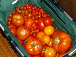 After 37 days without a drop of rain, six-tenths of an inch fell on my garden yesterday, slowly enough to soak into the ground without much runoff. At last–a reprieve from watering! The only upside to the prolonged drought has been excellent fruit setting on my tomato plants. No rain means that the tomato flowers are open for pollination all day, and no rain means the bees are out doing their work nearly all day. Pictured is a single day’s harvest from my eighteen currently productive plants (after I gave some away).