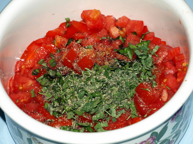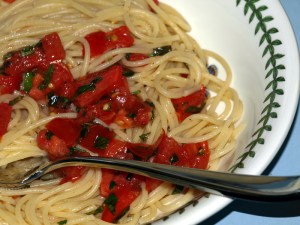 A quick search through my shelf of Italian cookbooks uncovered Marcella Hazan’s Spaghettini col Sugo di Erbe e Pomodoro Crudo (p 140 in Marcella’s Italian Kitchen), which might rate this summer’s honors as the best uncooked tomato sauce. This simple preparation preserves the tomatoes’ fresh color, texture, and taste, while tempering their acidity with hot olive oil and a shower of fresh herbs. Happily, I had all of the ingredients growing right outside my back door. A bonus for the impatient cook: the sauce is easily prepared while the pasta cooks.