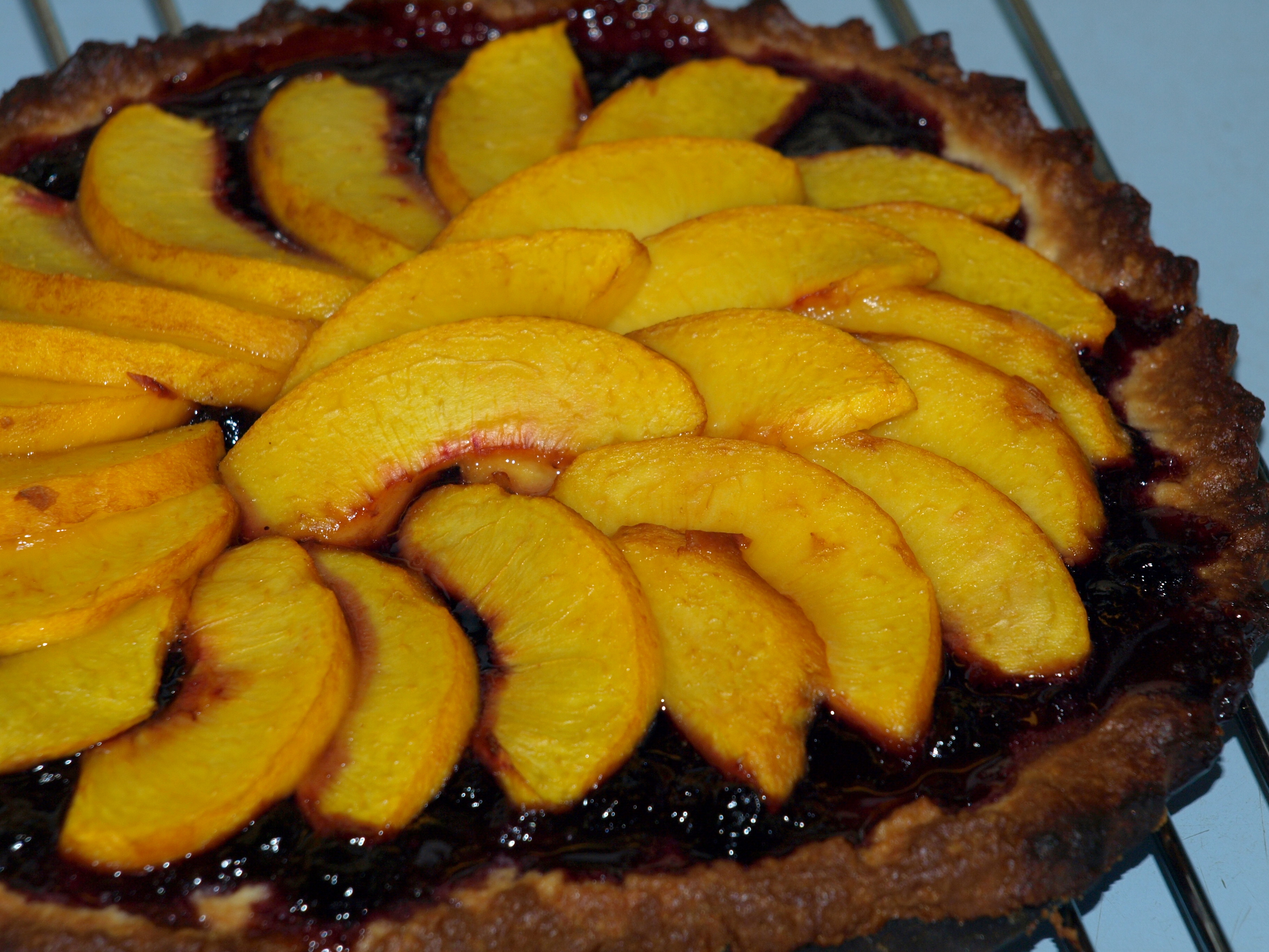 Back to the tart: once the dough is pressed into a pan, partially bake it at 350 for 10-15 minutes until it just begins to brown around the edges. Remove it from the oven and spoon on 3-5 tablespoons of good quality jam, spreading it nearly to the edges. Top with a layer of thinly sliced stone fruit. Bake for an additional 15 to 20 minutes (or longer, for a more deeply browned crust). The peach-blueberry tart pictured above was baked in a $40 convection toaster oven, so I didn’t even have to heat up my kitchen to turn out this treat.